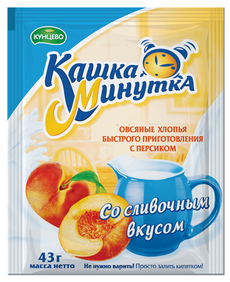 хлопья овсяные, сахар, заменитель сухих сливок (сухая молочная сыворотка, рафинированное кокосовое масло), кусочки сушеного персика, соль, ароматизаторы "Персик", "Сливочный".