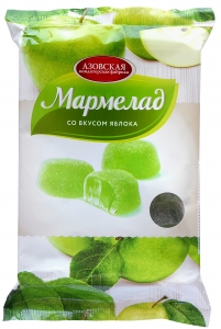 Сахар, патока, желирующий агент пектин, смесь сухая на основе соков и пюре «Мультифрукт» (мальтодекстрин (кукурузный), концентрированное абрикосовое пюре, концентрированный сок лайма, концентрированное клубничное пюре, концентрированный сок кислой вишни), регуляторы кислотности: лимонная кислота, цитрат натрия, краситель медные комплексы хлорофиллинов, ароматизатор натуральный «Яблоко».