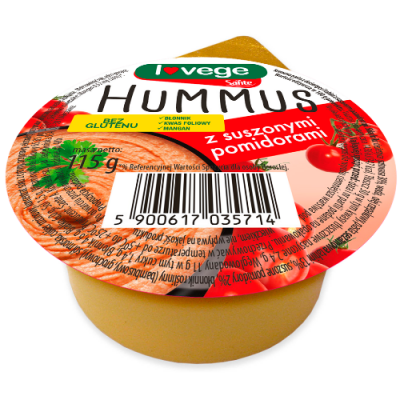 Вареный нут 27 %, вода, рапсовое масло, кунжутная паста тахини 12 %, сушеные томаты 2 %, растительное волокно (бамбук, горох), морская соль, тростниковый сахар, концентрированный лимонный сок, специи (сушеный помидор, лук, черный перец, белый перец, базилик, чеснок, тимьян), экстракты пряностей (морская соль, тмин, тростниковый сахар, паприка, концентрат лимонного сока, куркума), натуральные ароматизаторы, куркума.